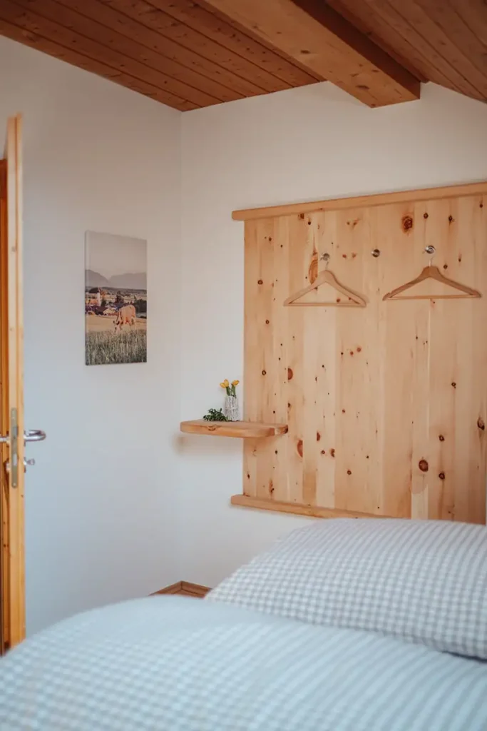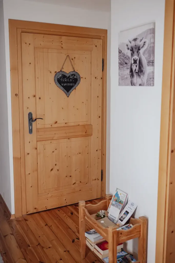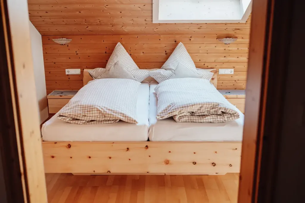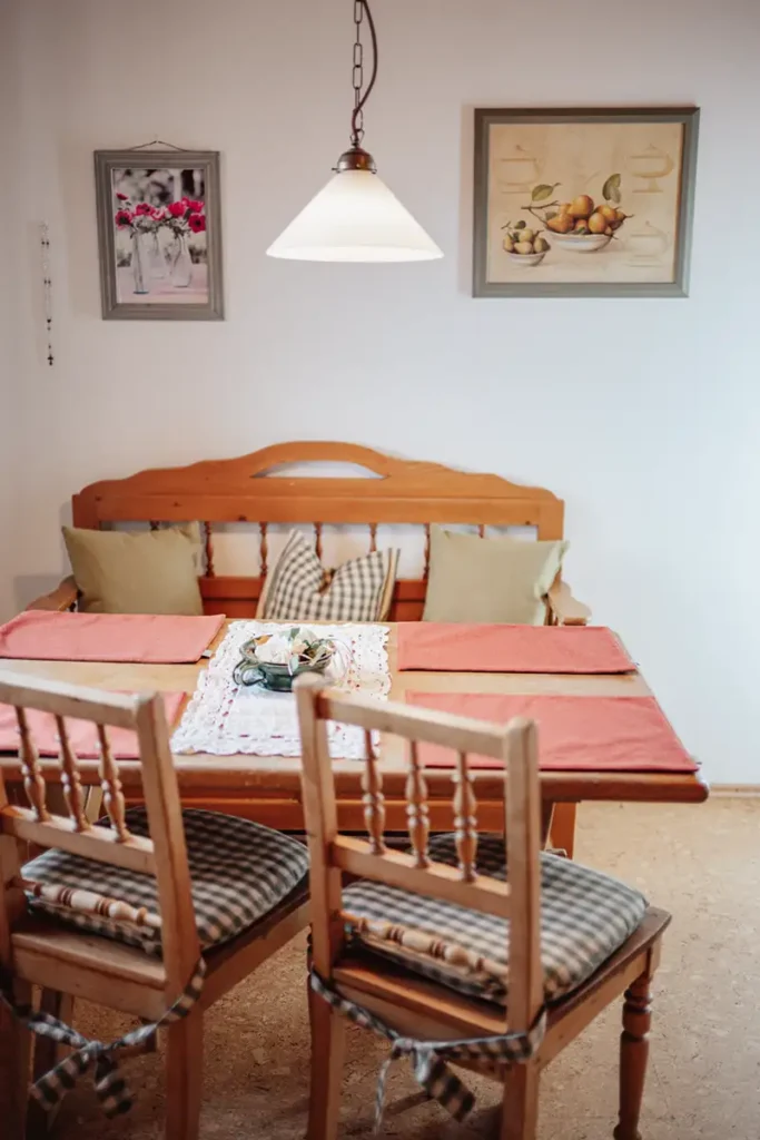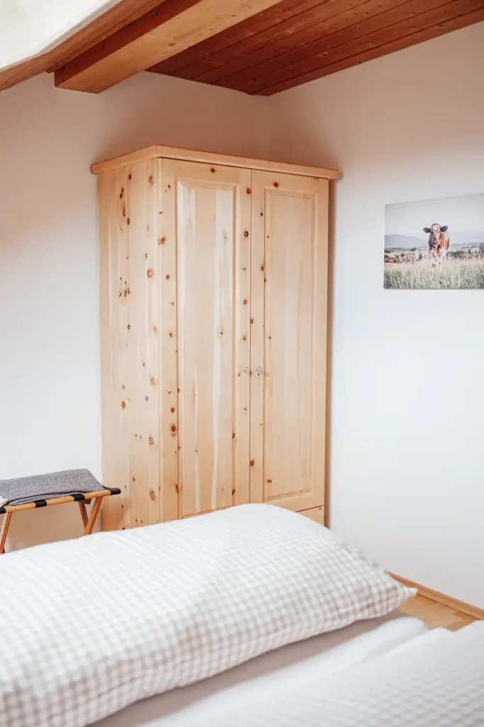 Sie besteht aus Schlafzimmer (neu: mit Zirbenbett), Wohnzimmer, Küche und Bad. Ein Abstellraum nimmt auch sperriges Gepäck problemlos auf, eine Garderobe sorgt ebenfalls für Ordnung.